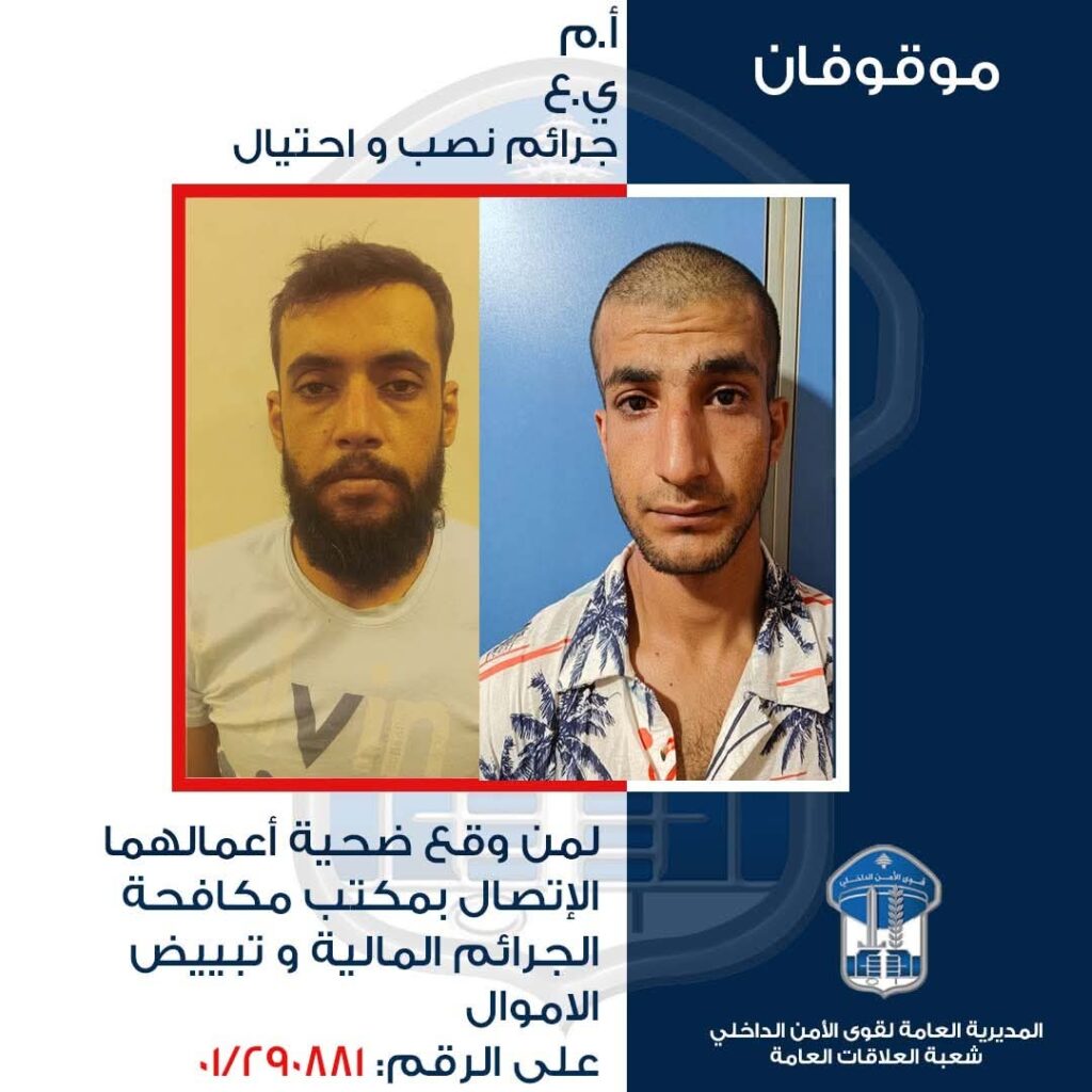 لذلك، تُعمّم المديريّة العامّة لقوى الأمن الدّاخلي، بناءً على إشارة القضاء المختص صورتَيهما، وتطلب من الذين وقعوا ضحية أعمالهما وتعرفوا إليهما، الحضور إلى مكتب مكافحة الجرائم الماليّة وتبييض الأموال، الكائن في محلّة بوليفار كميل شمعون/ ثكنة العقيد جوزف ضاهر، أو الاتّصال على الرقم: 290881-01، تمهيداً لاتّخاذ الإجراءات القانونيّة اللّازمة