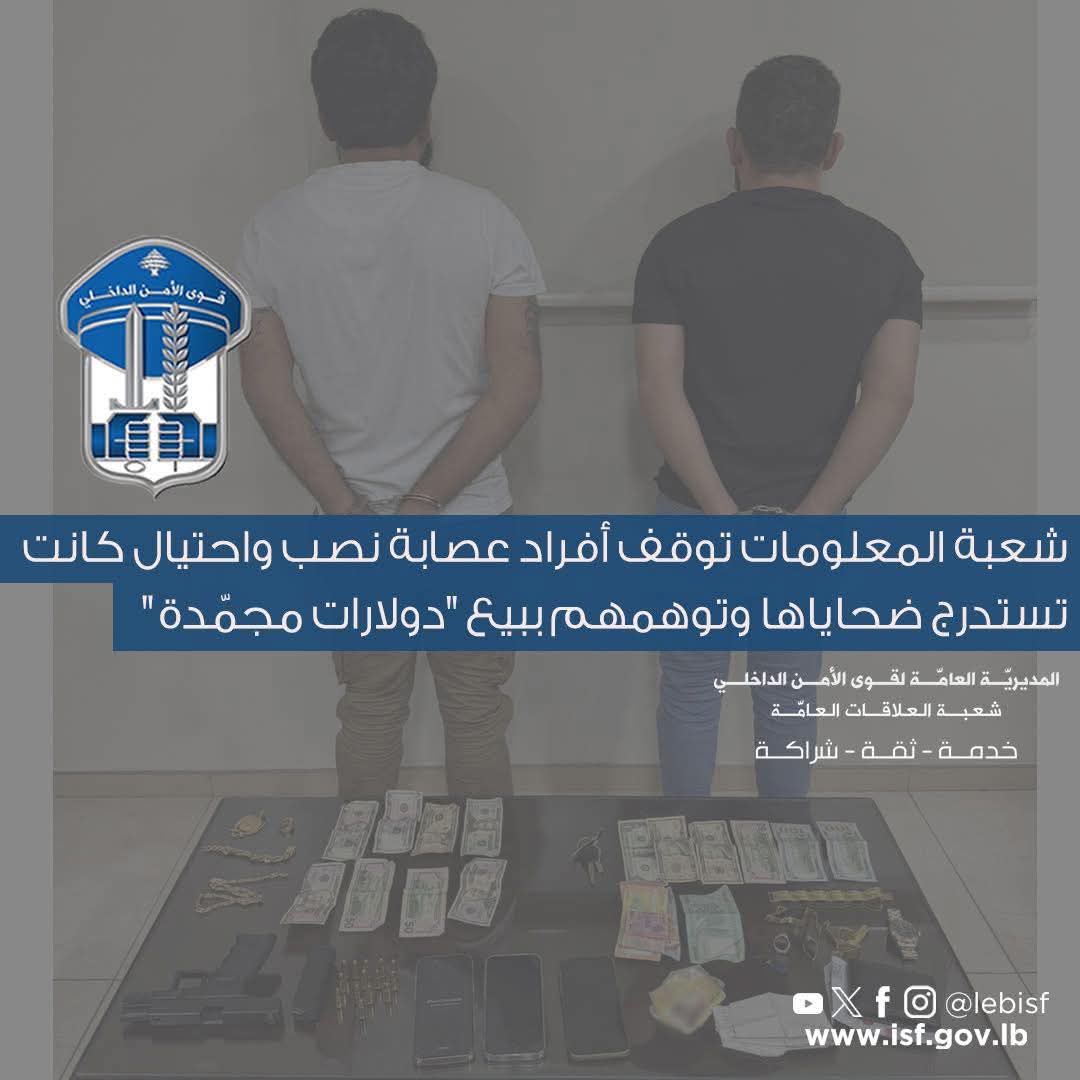 في إطار المتابعة المستمرّة التي تقوم بها قوى الأمن الدّاخلي لمكافحة عمليات السرقة والاحتيال في مختلف المناطق اللبنانية، توافرت معطيات لشعبة المعلومات حول تعرّض عدد من المواطنين لعمليات سرقة بطريقة احتيالية ينفّذها مجهولون يقومون باستدراج ضحاياهم، من خلال إيهامهم بأنه لديهم “دولارات مجمّدة” للبيع. وعند التقائهم بالضحية، يسرقون أموالها بطريقة احتيالية ويتوارون عن الأنظار.