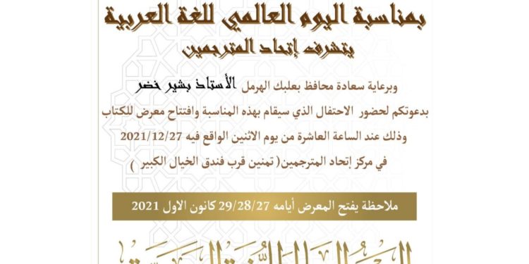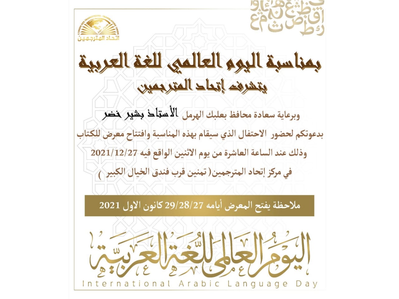 يتشرف إتحاد المترجمين و برعاية سعادة محافظ بعلبك الهرمل الأستاذ بشير خضر بدعوتكم لحضور إحتفال الذي سيقام بهذه المناسبة وافتتاح معرض الكتاب ، ذلك عند الساعة العاشرة من يوم الاثنين الواقع فيه 27/12/2021 في مركز اتحاد المترجمين ( تمنين قرب فندق الخيال الكبير) .