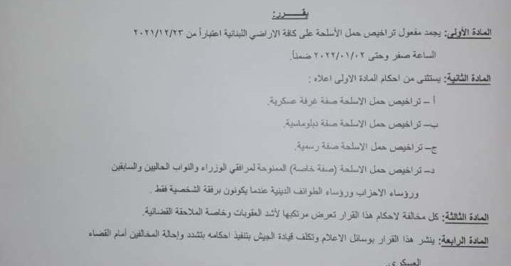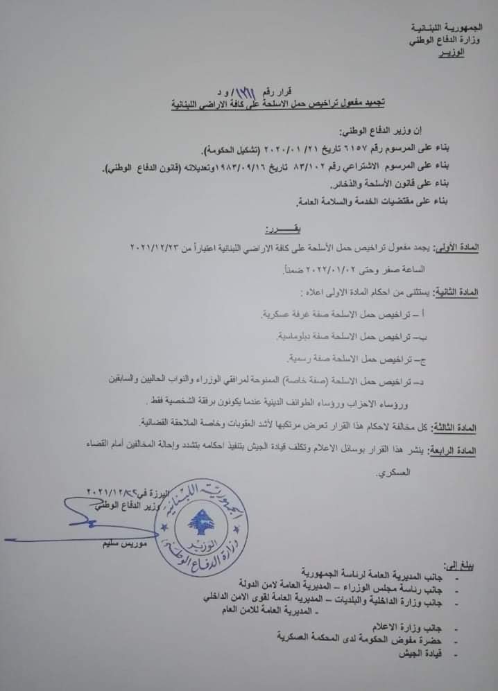 جمّد وزير الدفاع هانري خوري مفعول تراخيص حمل الأسلحة على كالة الأراضي اللبنانية اعتباراً من 23/12/2021 حتى 2/1/2021 ضمناً.