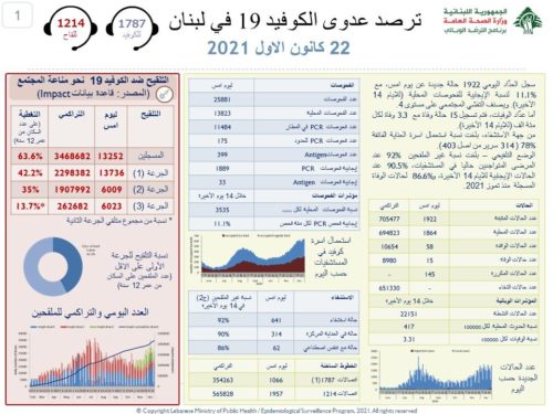 أعلنت وزارة الصحة العامة في تقريرها اليومي تسجيل 1922 إصابة جديدة بفيروس كورونا إضافةً الى  15 حالة وفاة خلال الساعات الـ24 الماضية.