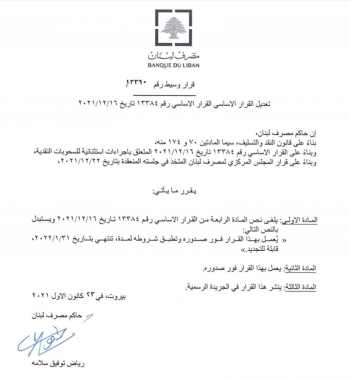 ولفت مصرف لبنان، بيان جاء فيه، أن “حاكم مصرف لبنان، بناء على قانون النقد والتسليف ، سيما المادتين 70 و 174 منه، وبناء على القرار الاساسي رقم 13384 تاريخ 16-12-2021 المتعلق باجراءات استثنائية للسحوبات النقدية، وبناء على قرار المجلس المركزي لمصرف لبنان المتخذ في جلسته المنعقدة بتاريخ 22-12-2021، يقرر ما ياتي: