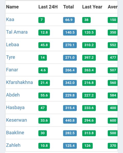 نشرت مصلحة الأبحاث العلمية الزراعية Lari التابعة لوزارة الزراعة اللبنانية تقريراً حول كمية الأمطار الهاطلة في مختلف المناطق اللبنانية. تضمن التقرير بيانات مفصلة شملت كميات الأمطار خلال الـ 24 ساعة الماضية, ومجموع الأمطار التراكمي لغاية اليوم مقارنةً بالفترة ذاتها من العام المنصرم, بالإضافة إلى المعدل السنوي العام لكل منطقة