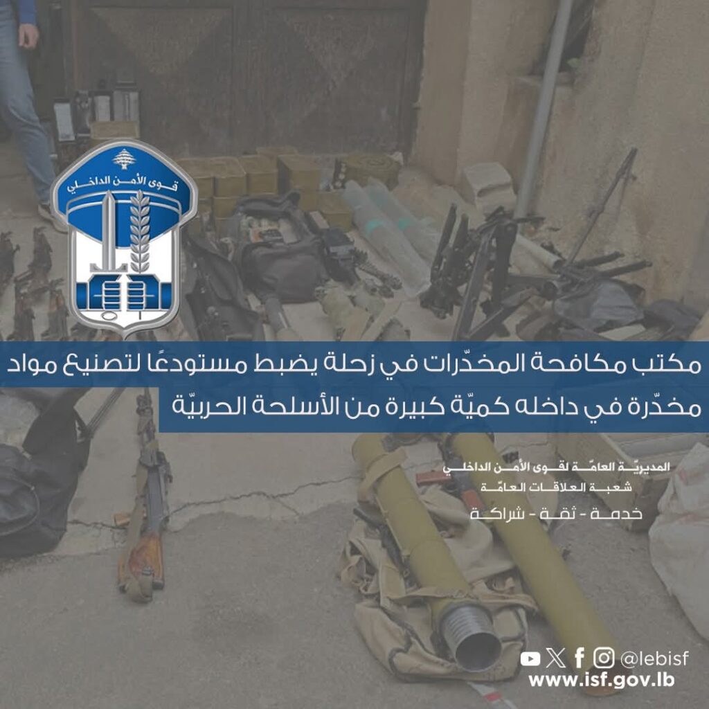وبعد أعمال الاستطلاع والكشف وجمع المعلومات، داهمت قوّة من مكتب مكافحة المخدّرات الإقليمي في زحلة، بتاريخ 23-12-2025، المستودع المذكور، حيث عثرت في داخله على
