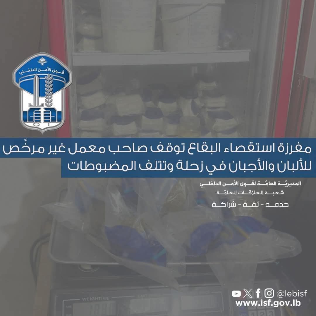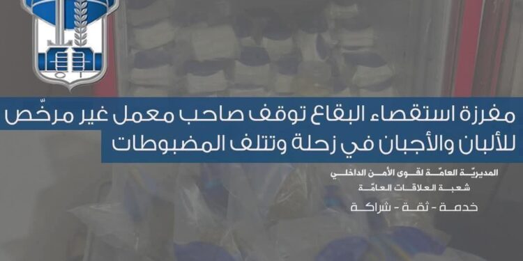 في إطار العمل المستمرّ الذي تقوم به قوى الأمن الداخلي لتوقيف مرتكبي مختلف أنواع الجرائم، ولا سيّما تلك المتعلّقة بالأمن الغذائي، توافرت معطيات لدى مفرزة استقصاء البقاع في وحدة الدّرك الإقليمي عن وجود معمل غير مرخّص لصناعة الألبان والأجبان في بلدة زحلة، وغير مستوفٍ للشروط الصحيّة المعتمدة.