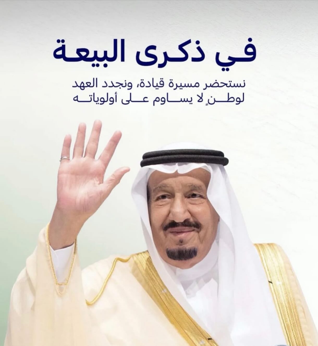 «في ذكرى البيعة، نجدد العهد لوطنٍ تقوده قيادة حكيمة وضعت العزم والرؤية أساساً للمستقبل. حفظ الله خادم الحرمين الشريفين الملك سلمان بن عبدالعزيز آل سعود».