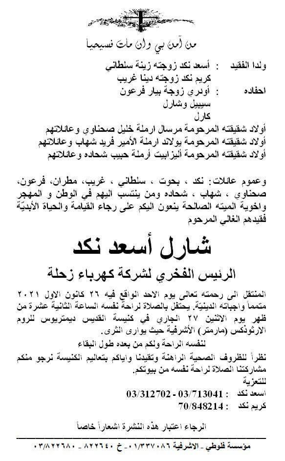 توفي الرئيس الفخري لشركة كهرباء زحلة شارل أسعد نكد والد مدير عام شركة كهرباء زحلة أسعد نكد و يحتفل بالصلاة لراحة نفسه الساعة الثانية عشرة من ظهر يوم الاثنين ٢٧ الجاري في كنيسة القديس ديمتريوس للروم الارثوذكس الأشرفية حيث يوارى الثرى.