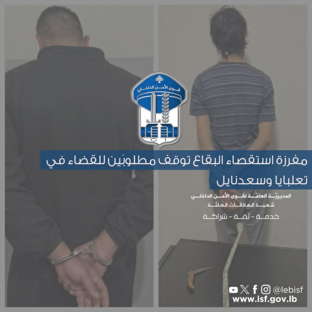 1- في إطار العمل المستمرّ الذي تقوم به قطعات قوى الأمن الدّاخلي لملاحقة المطلوبين للقضاء وتوقيفهم، وبنتيجة الاستقصاءات والتّحرّيات التي قامت بها مفرزة استقصاء البقاع في وحدة الدّرك الإقليمي، تمكّنت إحدى دوريّاتها، بتاريخ 29-1-2026، من توقيف شخص في بلدة سعدنايل، ويُدعى: