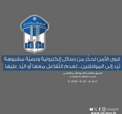 لذلك، تطلب المديريّة العامّة لقوى الأمن الدّاخلي عدم الرّد أو التّفاعل مع هذه الرسائل تحت أي ظرف، مع الإبلاغ عنها فورًا إلى القطعات الأمنيّة المعنيّة، لِما لذلك من أثرٍ في الحدّ من فرص استغلال المواطنين أو المؤسّسات وتعزيز الأمن السّيبراني الوطني.