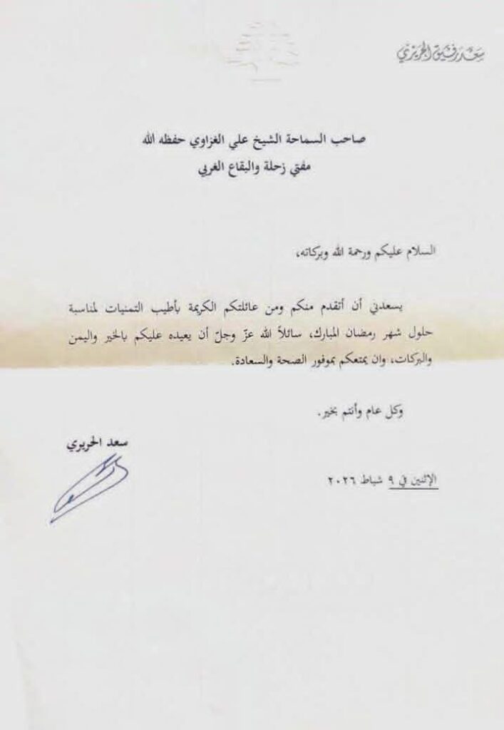 تسلّم سماحة مفتي زحلة والبقاع الدكتور الشيخ علي الغزاوي، كتاب تهنئة بحلول شهر رمضان المبارك من الرئيس سعد الحريري، نقله إليه منسق عام تيار المستقبل في البقاع الأوسط، الحاج سعيد ياسين.