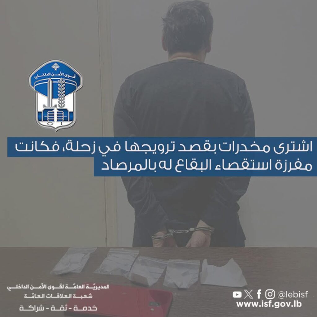 في إطار العمل المستمرّ الذي تقوم به قوى الأمن الداخلي لمكافحة الجرائم على اختلاف أنواعها على جميع الأراضي اللبنانية وتوقيف مرتكبيها، لا سيّما تجارة وترويج المخدّرات، توافرت معلومات لمفرزة استقصاء البقاع في وحدة الدرك الإقليمي عن قيام المدعو: