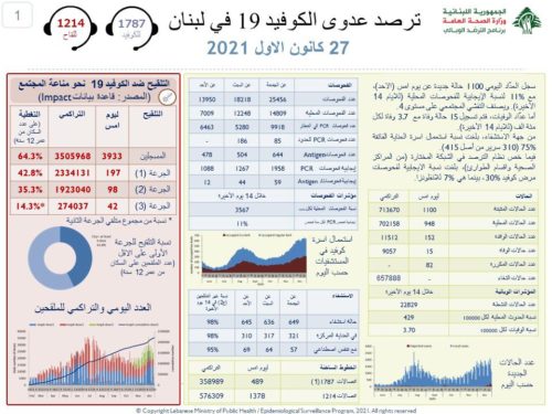 أعلنت وزارة الصحّة اللبنانية عن تسجيل ١،١٠٠ إصابة جديدة بفيروس كورونا ليرتفع العدد الإجمالي إلى ٧١٣،٦٧٠ حالة.
