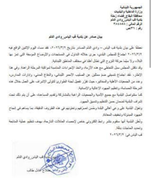 وختمت البلدية بدعوة أبناء قب الياس – وادي الدلم إلى التحلّي بالوعي وروح المسؤولية والتعاون في هذه الظروف الدقيقة, بما يسهم في تخفيف المعاناة وتعزيز التضامن الاجتماعي في مواجهة الأزمة.
