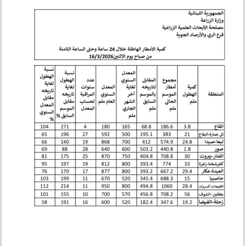 نشرت مصلحة الأبحاث العلمية الزراعية تقريراً حول كمية الأمطار الهاطلة خلال الـ 24 ساعة الماضية وحتى الساعة الثامنة من صباح يوم الاثنين 16/3/2026, وجاءت البيانات كالتالي: