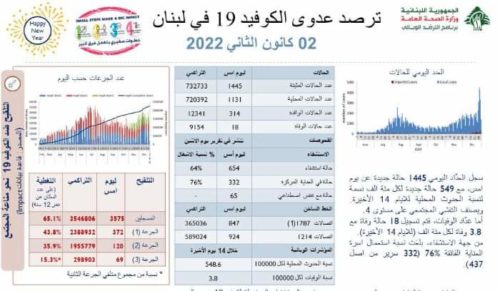أفادت وزارة الصحة العامة ، عن تسجيل 1445 إصابة جديدة بفيروس “كورونا”، و18 حالة وفاة.