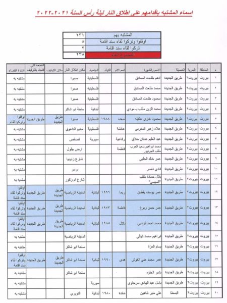 تعمّم هذه المديرية العامة لائحة بأسماء /238/ مشتبهًا بهم بإطلاق النار التّي وردت من القطعات حتى الساعة، مع العلم أنه تم توقيف /5/ أشخاص منهم لمدة /48/ ساعة، تركوا فيما بعد بسندات إقامة، وشخصين جرى استماعهما وتركا بسندي إقامة بناء لإشارة القضاء المختص. قوى الأمن مستمرّة بملاحقة المتورّطين.