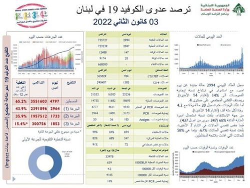 أعلنت ​​وزارة الصحة العامة​ في تقريرها اليومي، تسجيل “2994 إصابة جديدة بفيروس “كورونا”، رفعت العدد التراكمي للحالات المثبتة إلى 735727”.