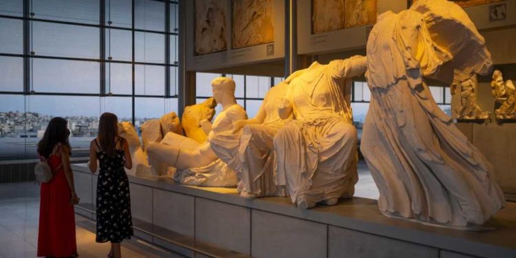 Two women visit the Athens Acropolis Museum as the museums and archaeological sites open at night for two days, on August 22, 2021. (Photo by Angelos Tzortzinis / AFP)
