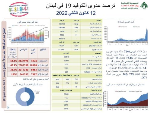 أعلنت وزارة الصحة العامة في تقريرها اليومي تسجيل “7246 إصابة جديدة بفيروس كورونا رفعت العدد التراكمي للحالات المثبتة الى 794744، كما تم تسجيل 14 حالة وفاة”.