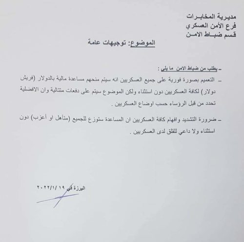 طلبت مديرية المخابرات من ضباط الأمن التعميم على جميع العسكريين، بأنّه “سيتم منح مساعدة مالية بالـ”فريش دولار”، لكافة العسكريين دون استثناء، ولكن على دفعات متتالية”.