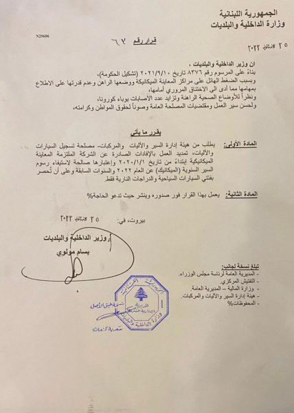 وقّع وزير الداخلية والبلديات القاضي بسام مولوي القرار رقم 63 والذي يقضي بالطلب الى هيئة إدارة السير والآليات والمركبات – مصلحة تسجيل السيارات والآليات، تمديد العمل بالإفادات الصادرة عن الشركة الملتزمة المعاينة الميكانيكية إبتداءاً من تاريخ 1/1/2020 وإعتبارها صالحة لإستيفاء رسوم السير السنوية (الميكانيك) عن العام 2022 والسنوات السابقة، على أن تُحصر بفئتي السيارات السياحية والدراجات النارية فقط.