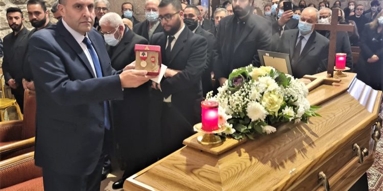 في نهاية الصلاة الجنائزية تحدث النائب سليم عون بإسم فخامة رئيس الجمهورية فقال: ” ايها الفقيد الغالي. تقديراً لفيض عطاءاتك النوعية التي أسديتها للقطاع العام، وإعلاء شأن الإدارة اللبنانية في المجالات الإدارية والإجتماعية والصحية التي تجلّت في مسيرتكم في وزارة الزراعة وفي المركز الصحي الإجتماعي في زحلة وادي العرائش، قرر فخامة رئيس الجمهورية العماد ميشال عون منحك وسام الإستحقاق اللبناني الفضي وكلّفني وشرّفني أن اضعه على نعشك في يوم وداعك وأن أتقدم من عائلتك بأحر التعازي”