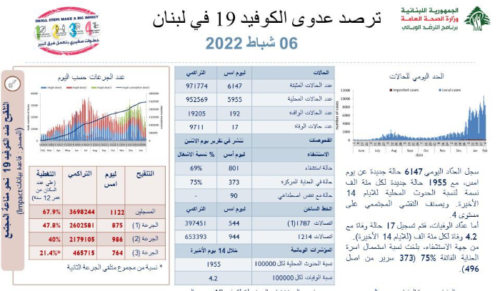 أعلنت وزارة الصحة العامة في تقريرها اليومي تسجيل “6147 إصابة جديدة بفيروس كورونا رفعت العدد التراكمي للحالات المثبتة الى 971774، كما تم تسجيل 17 حالة وفاة”.