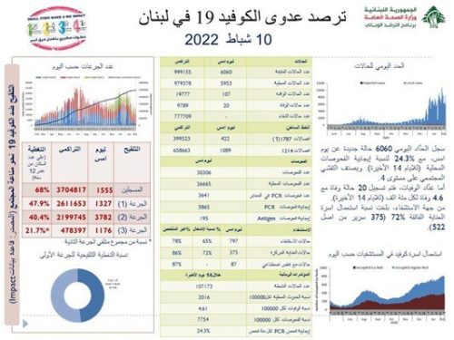 أعلنت وزارة الصحة العامة في تقريرها اليومي تسجيل “6060 إصابة جديدة بفيروس “كورونا” رفعت العدد التراكمي للحالات المثبتة الى 999155، كما تم تسجيل 20 حالة وفاة”.