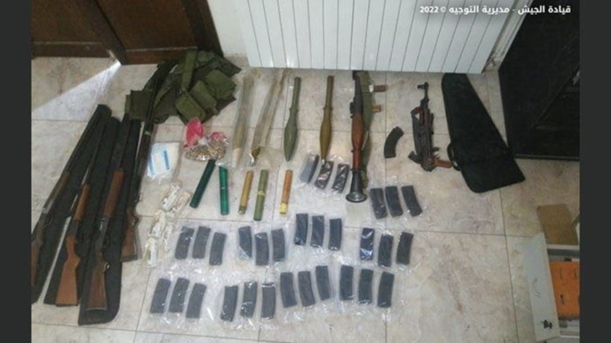 بتاريخ 12 / 2 / 2022، دهمت دورية من مديرية المخابرات في منطقة الكنيسة ــــ بعلبك، منزل المطلوب (إ.ز) وأوقفته وضبطت سيارة جيب نوع شوفروليه Tahoe دون لوحات، قاذف “آر بي جي” مع /4/ قذائف، سلاح حربي نوع كلاشينكوف وأعتدة وذخائر حربية.