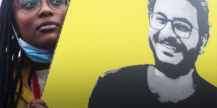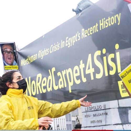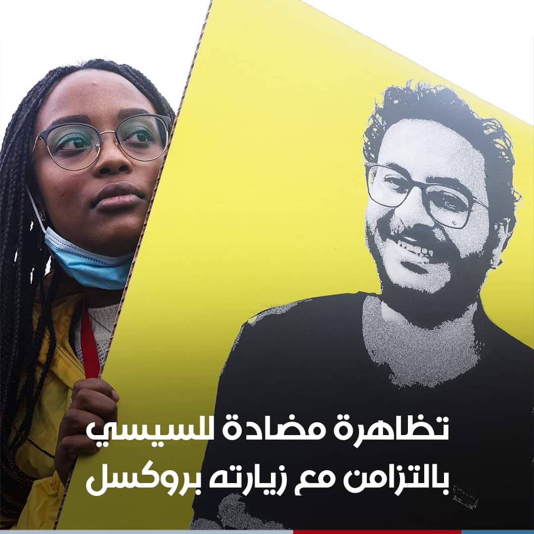 المتظاهرون تجمعوا خارج سور القصر الملكي البلجيكي ورفعوا صور الباحث المصري أحمد سمير سنطاوي والذي اعتقل مطلع شهر فبراير، ووجهت له تهم “الانضمام لجماعة إرهابية”، و”نشر أخبار كاذبة”، بحسب تقرير لمنظمة “هيومن رايتس ووتش”.