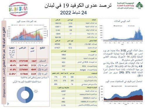 أعلنت وزارة الصحة العامة تسجيل 3152 إصابة جديدة بكورونا و17 حالة وفاة.