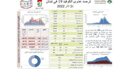 أعلنت وزارة الصحّة تسجيل 399 إصابة جديدة بكورونا و4 حالات وفاة خلال الـ24 ساعة الماضية.