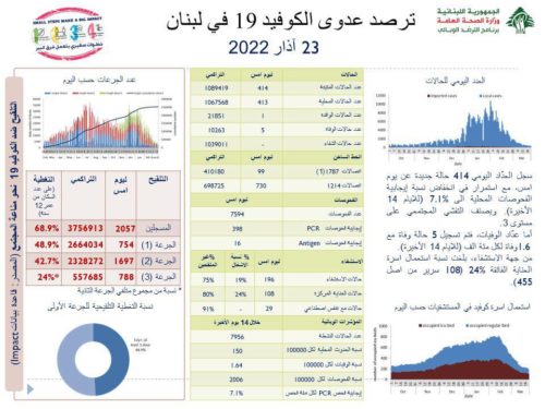 اعلنت وزارة الصحة في تقريرها اليومي، تسجيل 414 اصابة جديدة بفيروس كورونا في لبنان خلال الـ24 ساعة الماضية، بالاضافة الى 5 حالات وفاة.