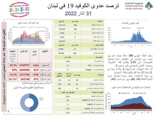 اعلنت وزارة الصحة في تقريرها اليومي، تسجيل 380 اصابة جديدة بفيروس كورونا في لبنان خلال الـ24 ساعة الماضية، بالاضافة الى 6 حالات وفاة.