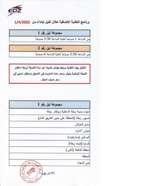 أعلنت شركة “كهرباء زحلة”، في بيان، أنه إبتداءً من 1/4/2022 سوف تضاف ساعتان ونصف تغذية إضافية خلال الليل موزعة على مجموعتين جديدتين على أن تبقى مجموعات ​النهار​ وأوقات القطع على حالها ما عدا مجموعة النهار رقم 1 (المتضمنة الدوائر الرسمية الأساسية) حيث يصبح القطع على الشكل التالي: من ​الساعة​ 11 قبل الظهر لغاية الساعة 12 ظهراً، ومن الساعة الرابعة لغاية الساعة الخامسة بعد الظهر.