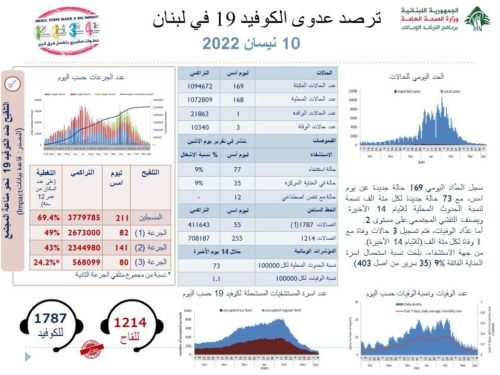 أعلنت وزارة الصحة في تقريرها اليومي، تسجيل 169 اصابة جديدة بفيروس كورونا خلال الـ24 ساعة الماضية، بالاضافة الى 3 حالات وفاة.