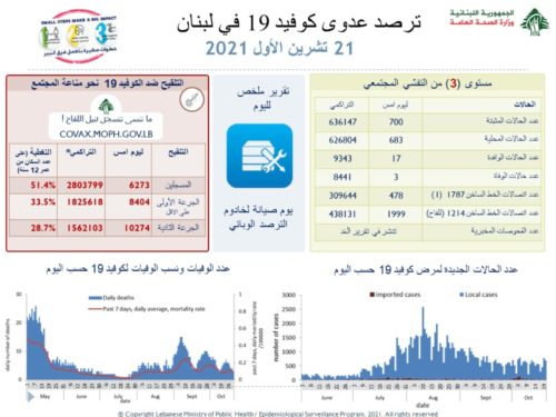 أعلنت وزارة الصحة العامة في تقريرها اليومي تسجيل 700 إصابة جديدة بفيروس كورونا رفعت العدد التراكمي للحالات المثبتة الى 636147، كما تم تسجيل 3 حالات وفاة.