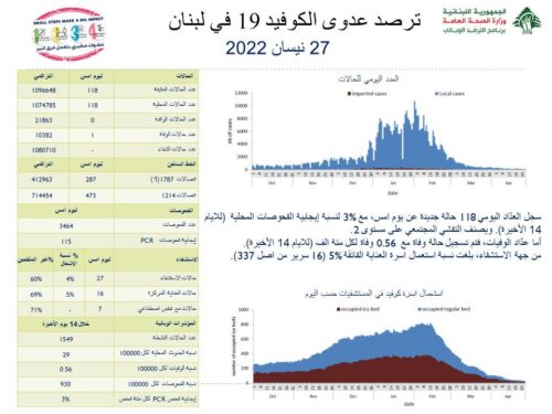 أعلنت وزارة الصحة العامّة في تقريرها اليومي حول مستجدات فيروس كورونا اليوم الأربعاء, عن “تسجيل 118 إصابة جديدة بكورونا (118 محلية و0 وافدة) ليصبح العدد الإجمالي للإصابات 1096648”.