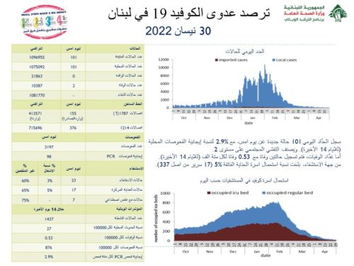 أعلنت وزارة الصحة العامّة في تقريرها اليومي حول مستجدات فيروس كورونا اليوم الخميس, عن “تسجيل 101 إصابة جديدة بكورونا (101 محلية و0 وافدة) ليصبح العدد الإجمالي للإصابات 1096763”.