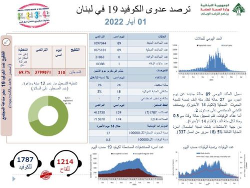 أعلنت وزارة الصحة العامّة في تقريرها اليومي حول مستجدات فيروس كورونا اليوم الأحد, عن “تسجيل 89 إصابة جديدة بكورونا (89 محلية وصفر وافدة) ليصبح العدد الإجمالي للإصابات 1097044”.