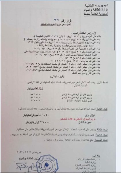 – بنزين 95 اوكتان 542000 بزيادة 35000 ليرة