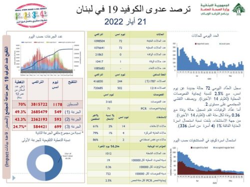 أعلنت وزارة الصحة العامّة في تقريرها اليومي حول مستجدات فيروس كورونا اليوم السبت, عن “تسجيل 72 إصابة جديدة بكورونا (72 محلية و0 وافدة) ليصبح العدد الإجمالي للإصابات 1098504”.
