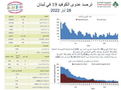 أعلنت وزارة الصحة العامّة في تقريرها اليومي حول مستجدات فيروس كورونا اليوم السبت, عن “تسجيل 94 إصابة جديدة بكورونا (94 محلية و0 وافدة) ليصبح العدد الإجمالي للإصابات 1099065”.