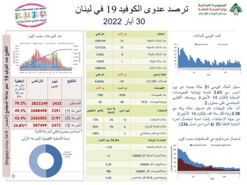 أعلنت وزارة الصحة العامّة في تقريرها اليومي حول مستجدات فيروس كورونا اليوم الاثنين, عن “تسجيل 51 إصابة جديدة بكورونا (51 محلية و0 وافدة) ليصبح العدد الإجمالي للإصابات 1099199”.