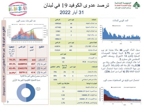 أعلنت وزارة الصحة العامّة في تقريرها اليومي حول مستجدات فيروس كورونا اليوم الثلاثاء, عن “تسجيل 66 إصابة جديدة بكورونا (66 محلية و0 وافدة) ليصبح العدد الإجمالي للإصابات 1099265”.