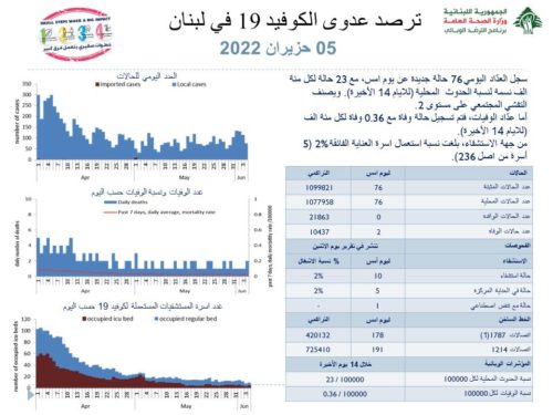 أعلنت وزارة الصحة العامّة في تقريرها اليومي حول مستجدات فيروس كورونا اليوم الأحد, عن “تسجيل 76 إصابة جديدة بكورونا (76 محلية و0 وافدة) ليصبح العدد الإجمالي للإصابات 1099821”.