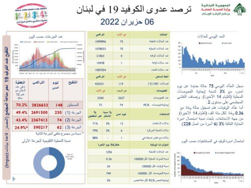 أعلنت وزارة الصحة العامّة في تقريرها اليومي حول مستجدات فيروس كورونا اليوم الإثنين, عن “تسجيل 75 إصابة جديدة بكورونا (75 محلية و0 وافدة) ليصبح العدد الإجمالي للإصابات 1099896”.