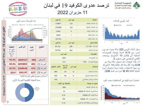 أعلنت وزارة الصحة العامة في تقريرها اليومي تسجيل “223 إصابة جديدة بفيروس كورونا رفعت العدد التراكمي للحالات المثبتة  إلى 1100871 ،كما تم تسجيل حالة وفاة واحدة “.