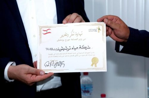 افتتح وزير الصناعة في حكومة تصريف الأعمال جورج بوشكيان خطّ إنتاج جديد في شركة مياه ترشيش- تالايا السبّاقة إلى تعبئة مياه الشرب في غالونات زجاجيّة. ويشمل الخط انتاج العصائر والمشروبات الغازيّة وغير الغازيّة، وذلك في إطار خطة توسّعية وانمائية تؤمّن منتجات جديدة للسوق المحلي والتصدير، فضلاً عن إيجاد فرص عمل والمساهمة في تنشيط الاقتصاد كما قال صاحب الشركة مارسيل الحاج.