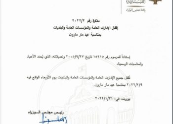 صدر عن رئاسة مجلس الوزراء، مذكرة تقضي بـ "إقفال جميع الإدارات والمؤسسات العامة والبلديات، يوم الأربعاء الواقع فيه 9 شباط...